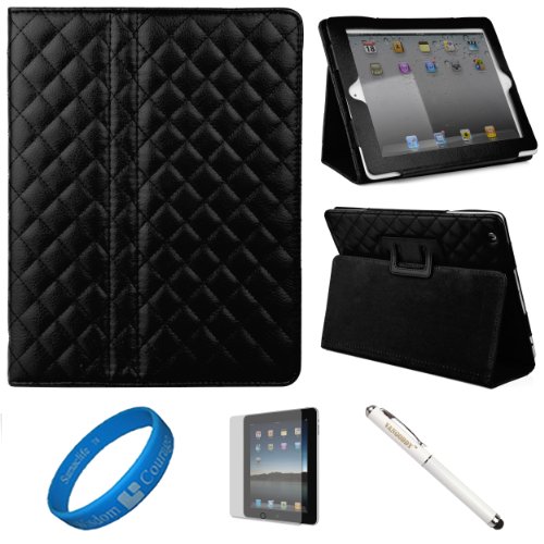 The Detailed Description of Black Quilted Diamond Design Leather Portfolio Case Cover with Integrated Fold to Stand Feature for Apple New iPad (iPad 3rd Generation) iPad 3 (16GB 32GB 64GB) and Apple iPad 2 + Anti Gloss Clear Screen Protector + Executive Laser Stylus Pen with LED Light + SumacLife TM Wisdom Courage WristbandFeatures